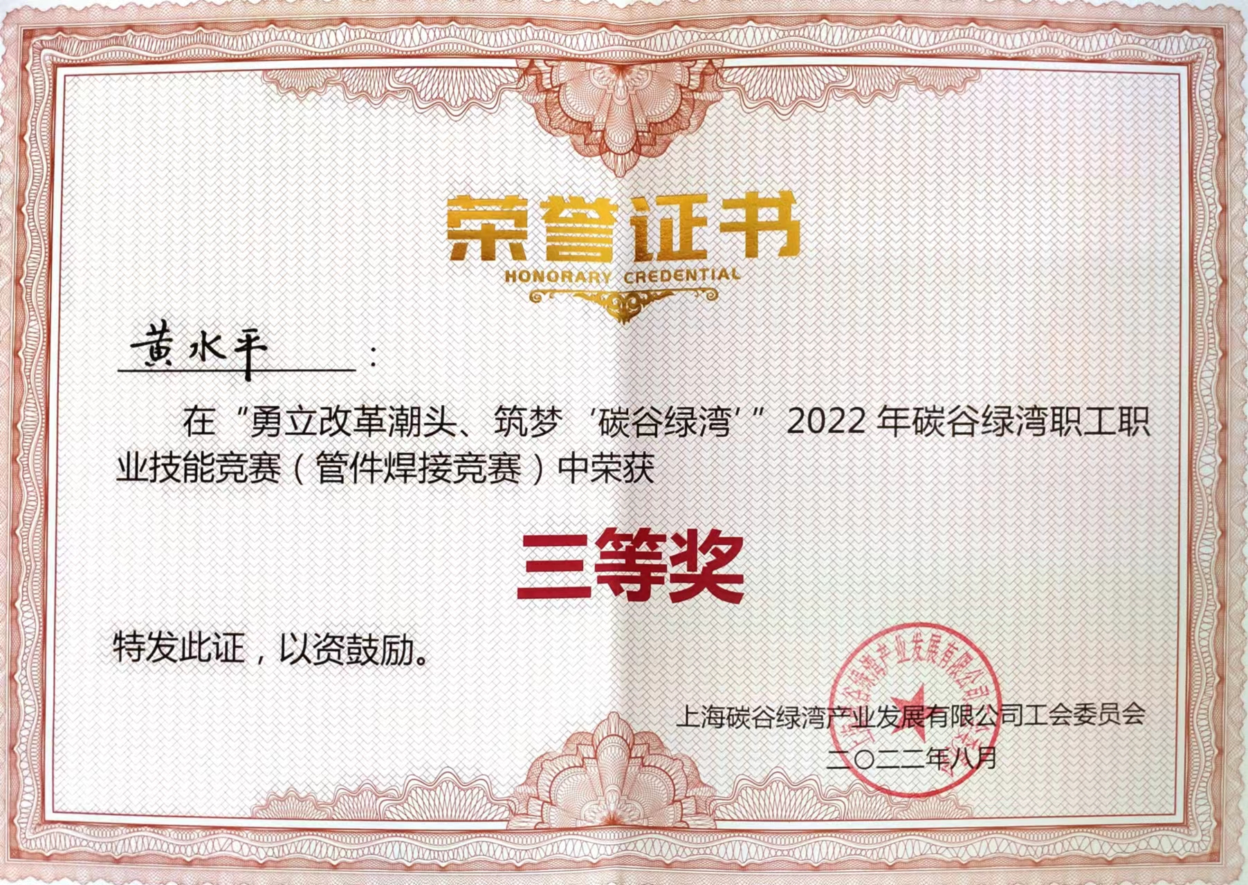 在“2022年碳谷绿湾职工职业技能竞赛”活动中,公司机修车间员工黄水平经过层层角逐,脱颖而出,荣获“管件焊接竞赛”三等奖。